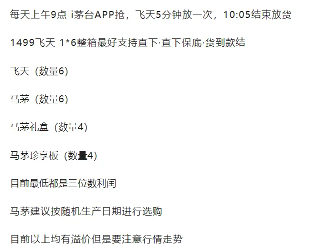 3.不要同一个手机,登录多个账号付款。4.不要多个账号填同一个名字、地址、和手机号。5.不要使用代付,尽量直接转给抢到的人,让他本人手机支付,收货地址和联系人手机号都填他本人的,或收货地址使用地址库。茅台1935,新珍品茅台,精品茅台,茅台十五年,公斤茅台,i茅台所有商品,低于抢购价