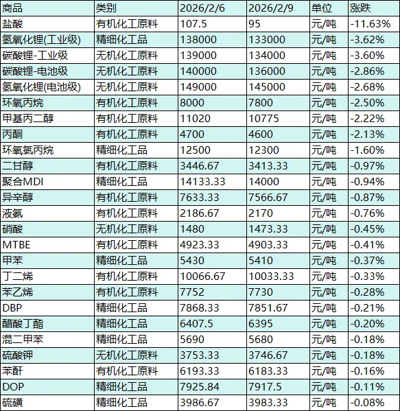 -下跌品种极端分化,双板块成重灾区:25种回调品种呈现“单品种深度暴跌、核心板块集体回调、多数品种窄幅波动”的特征,无系统性下跌风险。盐酸以-11.63%的单日跌幅大幅领跌,成为今日最大跌幅品种,回调力度创近期单日新高,价格从107.5元/吨跌至95元/吨,跌至年内低位区间;锂盐板块打破此前分化格局,呈现四品种同步回调态势,工业级氢氧化锂(-3.62%)、工业级碳酸锂(-3.60%)跌幅居前,电池级碳酸锂(-2.86%)、电池级氢氧化锂(-2.68%)同步承压;环氧丙烷(-2.50%)、甲基丙二醇(-2.22%)、丙酮(-2.13%)构成中幅回调梯队;其余18种下跌品种跌幅均不足1.6%,其中15种品种跌幅低于0.8%,以苯乙烯、丁二烯、异辛醇等基础化工溶剂、芳烃下游品种为主,回调多为节前短期博弈导致,供需基本面未发生根本性变化。