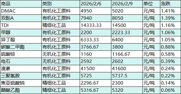 -板块分化显著,强弱格局清晰:精细化工板块逆势回暖,DMAC、双酚A、TDI等品种依托下游高端需求支撑与阶段性供需紧平衡稳步上涨;锂电材料板块集体走弱,尽管行业处于去库态势,但节前资金撤离加剧短期回调;基础化工板块整体偏弱,甲醇、异丁醛等少数品种受装置检修支撑小幅上涨,苯乙烯、丁二烯等多数品种窄幅回调,呈现“成本有撑、需求不足”的弱稳格局;无机化工板块两极分化,盐酸因供需严重失衡暴跌,硫酸铵、电石等品种依托刚需小幅上涨,整体呈现弱稳态势。