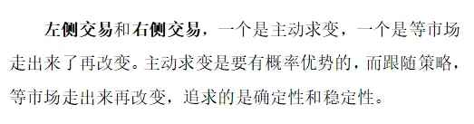 左侧交易和右侧交易,一个是主动求变,一个是等市场走出来了再改变。主动求变是要有概率优势的,而跟随策略,等市场走出来再改变,追求的是确定性和稳定性。