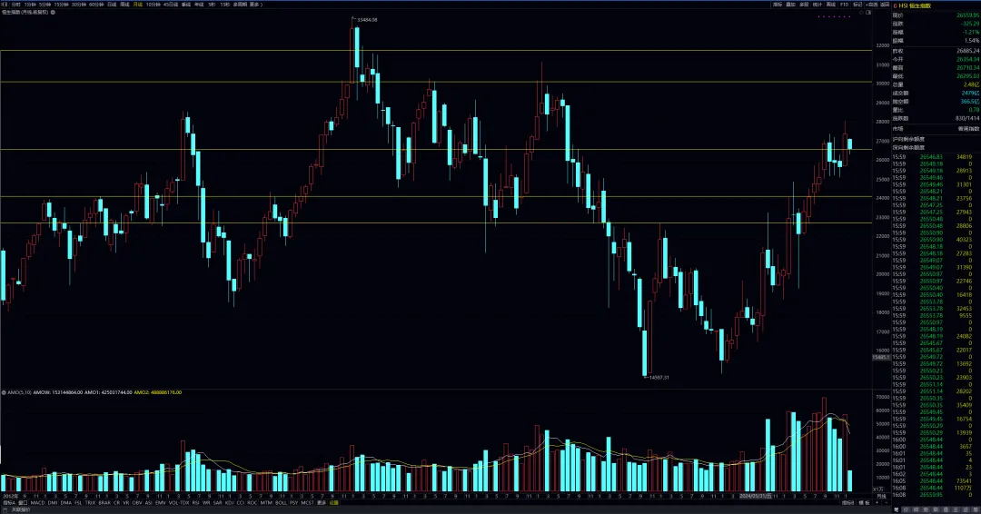 恒生指数月线图,23000-《24000-26500-30000-》32000。月结构图表上走势处于持续加速走势,势头有所减弱,波动逐步增大。
