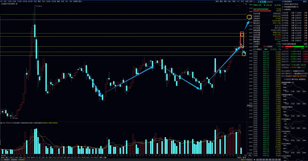 上证指数月线标注图,3750-《3850-4000-4300-4400-》4800。月结构图表上走势维持加速后的震荡走势,后续在3850-4400大区域运行的几率自增大,4000位置为强弱平衡点。