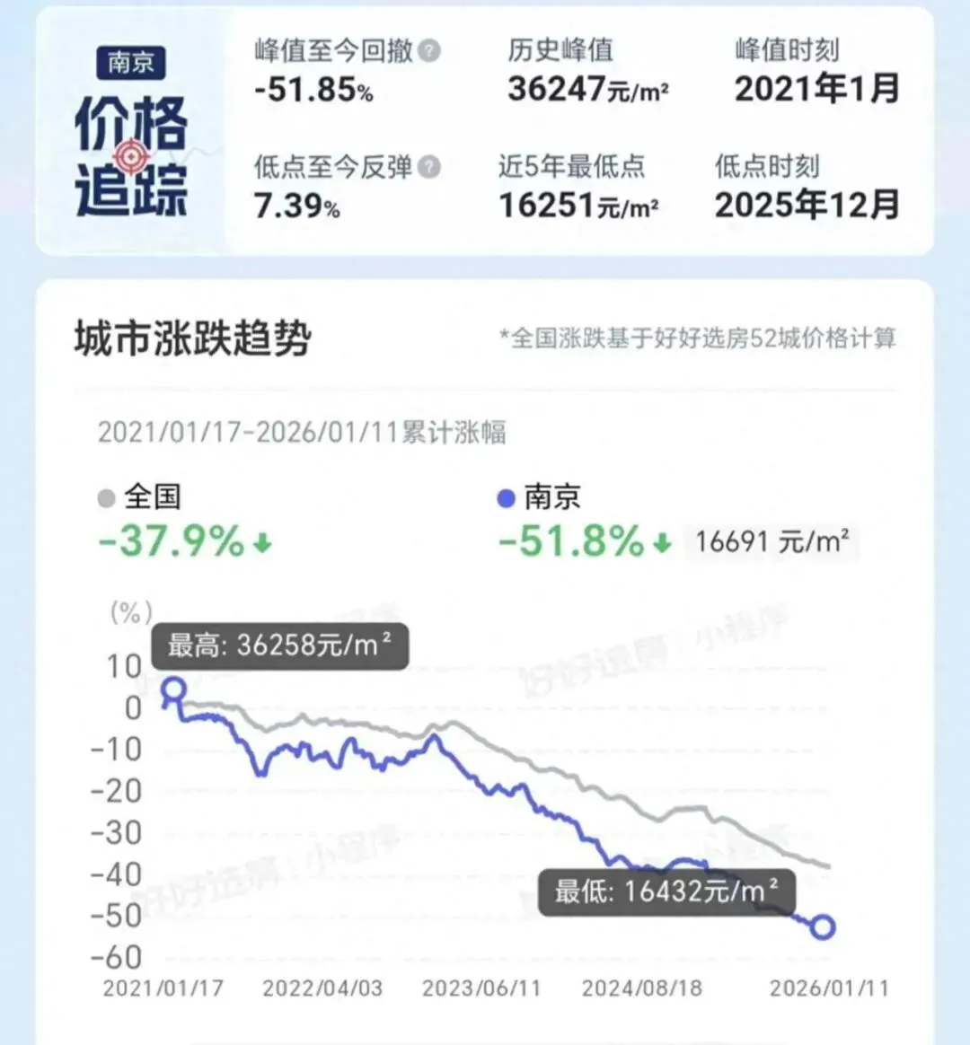 为什么会轮到南京站出来,在这点上特地把这几年的数据整理出来看了看,如果从2021年最高点开始算,南京整体房价已经跌了51.8%,而全国平均跌幅只在37.9%左右,相当于南京比全国多跌了14个点,说得直白一点,之前那几年骂南京房价虚高的人,现在多多少少也得承认,南京这两年已经跌到有点脱离实际价值的程度,房子本身并没有烂在那,地铁线路还在照常运行,人也没有大规模流失,只是情绪被压得太狠,一旦手稍微一松,就会出现一波回弹,这种走势其实就是典型的跌过头之后的自我修复,