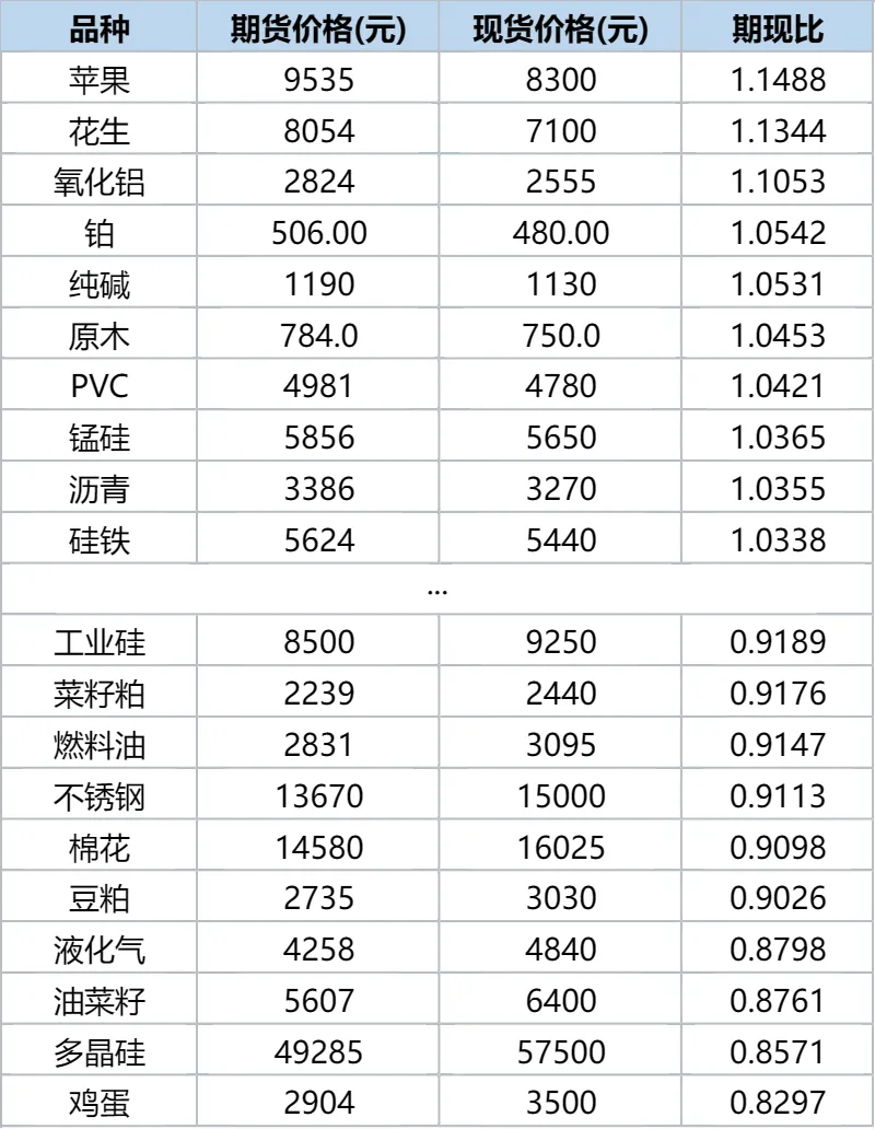 说明:期现比=期货主力合约价格/现货价格,大于1为期货升水,小于1为期货贴水。