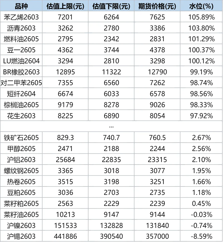 说明:估值上限、估值下限数据采自文华财经的多因子估值数据库,价格水位= 当前期货价格/估值数据,价格水位处于0值附近代表当前期货价格处于低位;价格水位处于100%附近代表当前期货价格处于高位。
