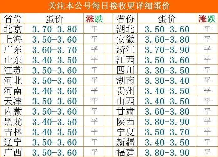 今日全国蛋价平稳运行,临近春节,鸡蛋价格维持在3.50-3.80元/斤,按质高低价均有,到货正常, 成交灵活,走货一般。