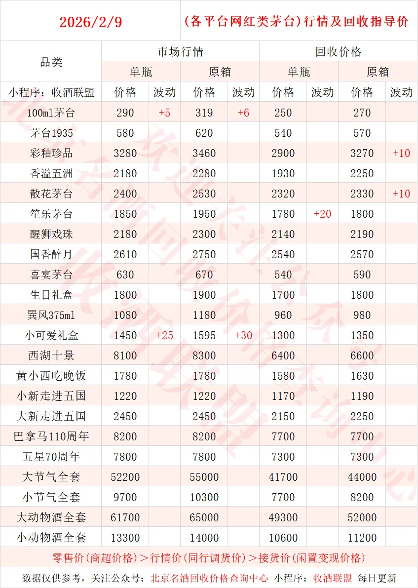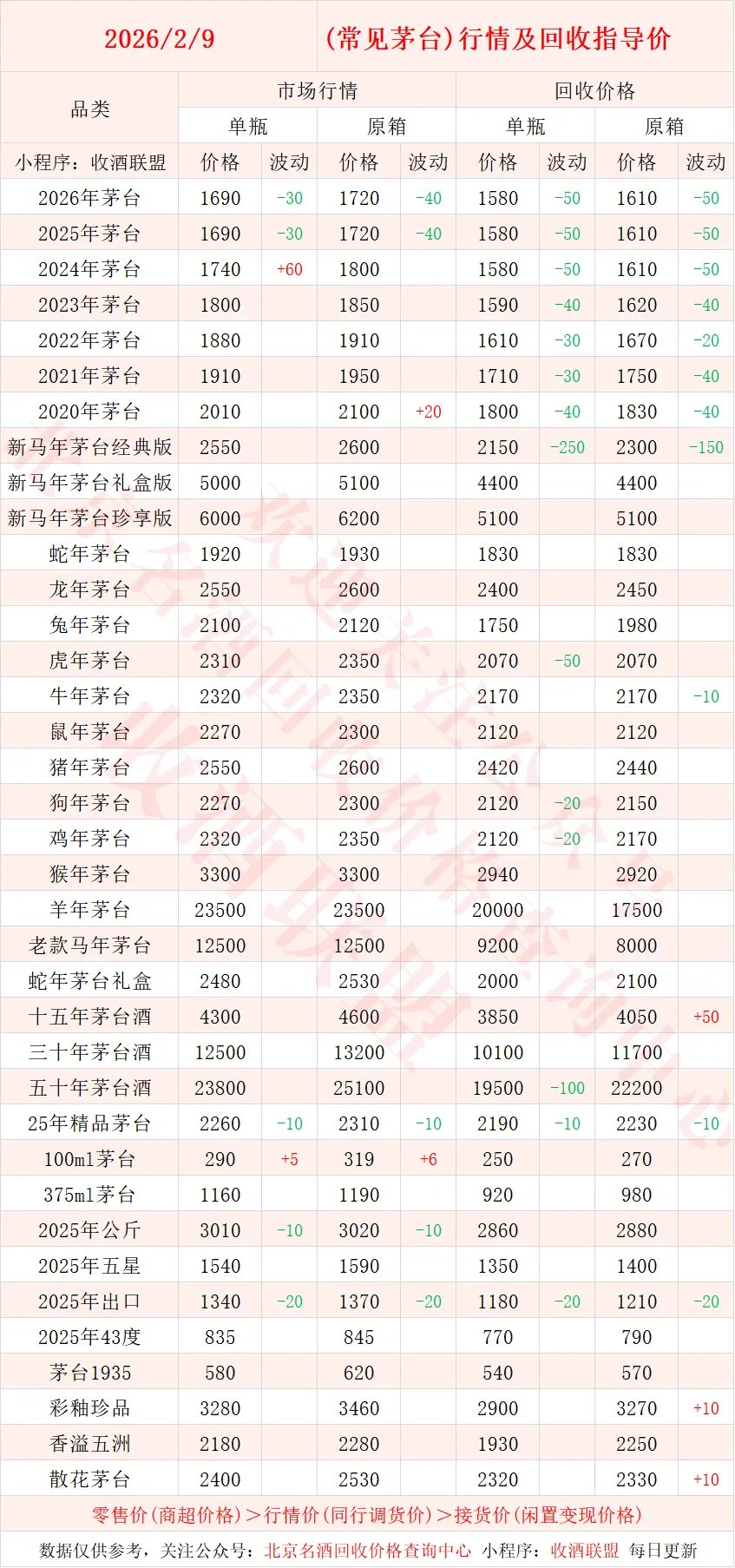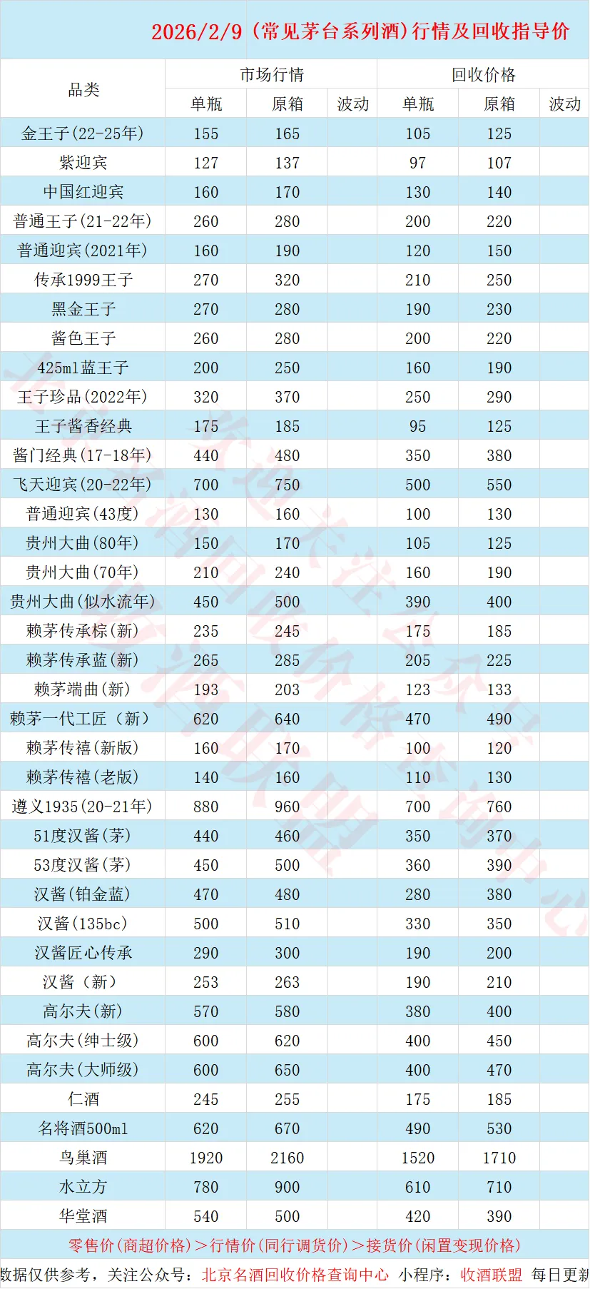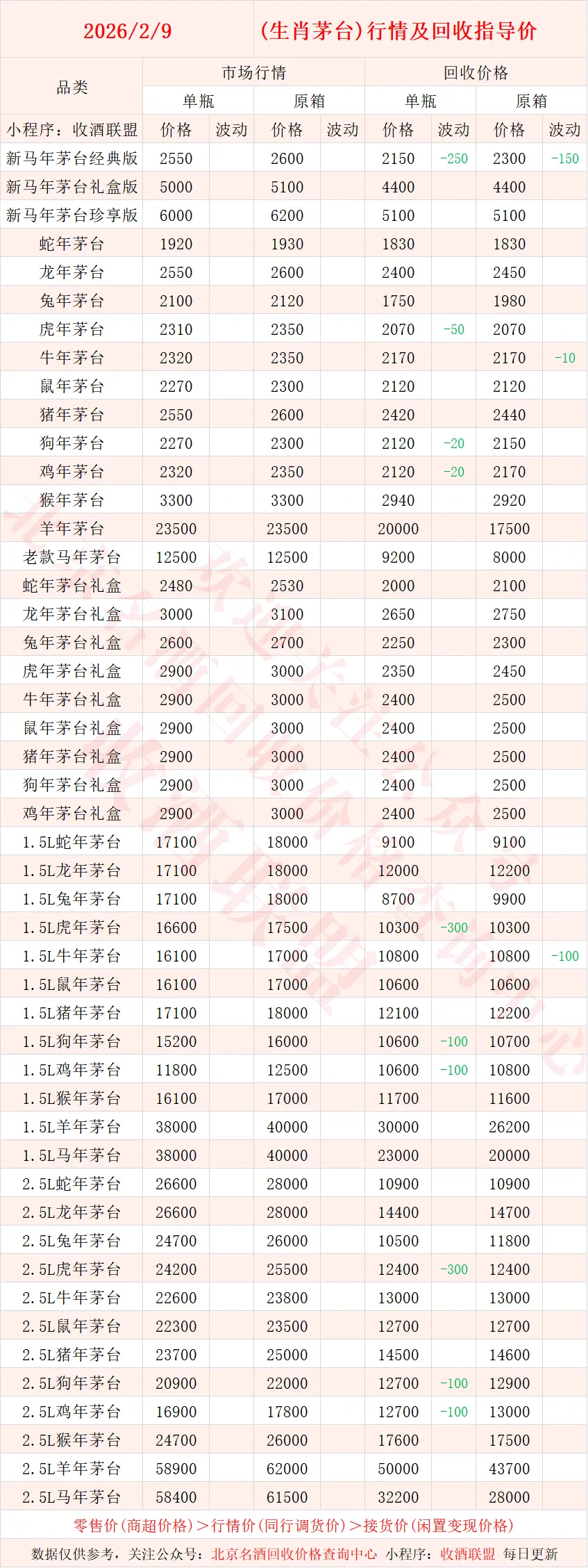 以下内容为,本公众号每日会及时更新的飞天茅台、生肖茅台、年份茅台,陈年茅台及不同毫升容量茅台的市场行情和回收报价;还包含五粮液、汾酒、剑南春、泸州老窖等国产名酒的行情及回收价,法国拉菲、木桐、玛歌等名庄红酒的回收报价,轩尼诗、马爹利、人头马等世界知名洋酒威士忌的回收参考价,每日整理不易,请点击关注支持。▪畅销类茅台行情及接货参考价▪