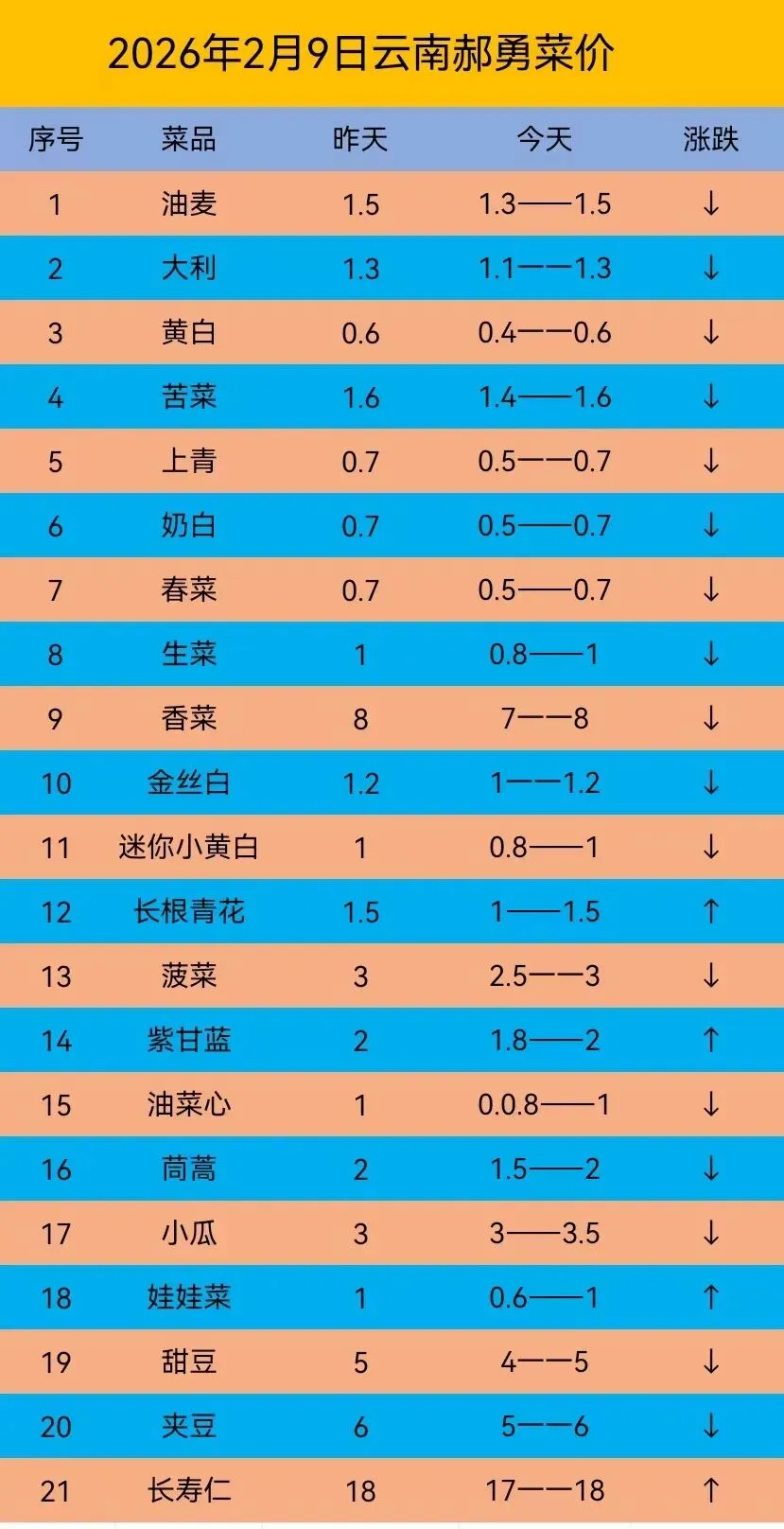 行情还是老样子。临近年关,产区冷库停库的比较多,发货的寥寥无几。销区本地菜还有很多,对云南叶菜造成很大冲击,走货量不大,接下来行情很难有气起色,平稳为主。
