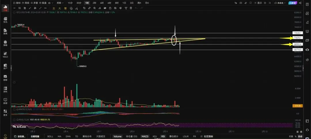 否则看不了一点,这两天的观点都差不多因为行情没啥太大的变化一直在71675-70073这区间走震荡。