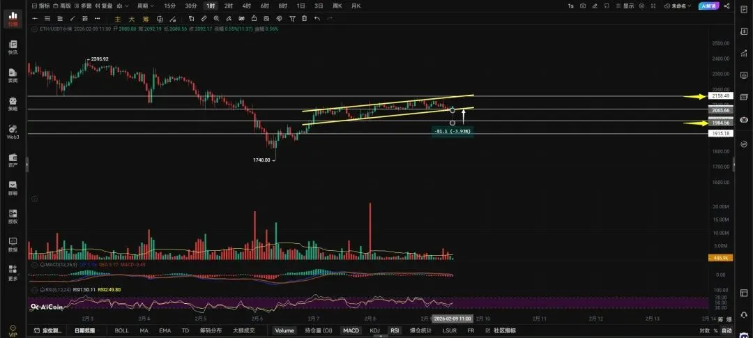 4小时级别跌破2090向下看2019-1969,二饼只要不跌破旗形啥事没有,旗形跌破就会走旗形1比1的下跌向下看1984附近,只要能保持在旗形内部运行就不会向下走回踩,想延续上涨必须突破2158才能看上方2215附近,突破不了2158涨不起来,散会。