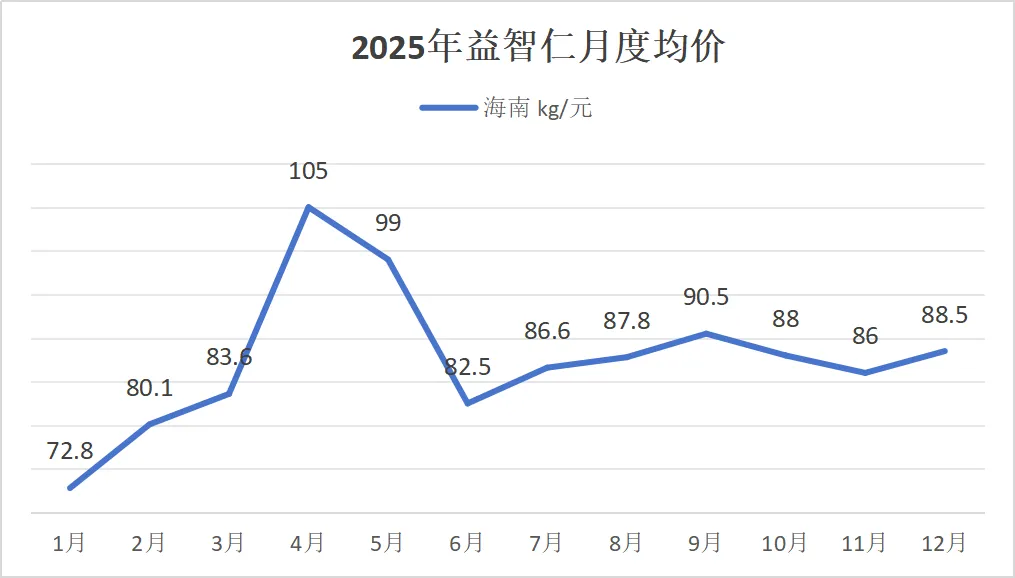 2025年,海南主产区减产预期一度推动市场情绪高涨,益智仁价格在4月曾突破105元/公斤的年内高点。在此期间,部分持货商对后市保持较强信心。然而进入5月后,价格并未延续强势上涨,逐步进入震荡回调与整理阶段。这一价格走势主要受以下因素影响: