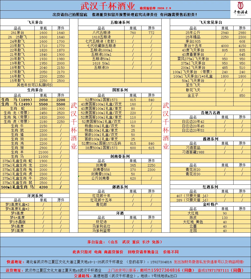 1、本行情价格为各品类酒的市场回收价格,查查收货线报以北京、上海、广州、深圳、贵阳、成都、武汉等7城市的主要酒行当天的报价来计算全国综合平均数据。实际成交价格每个城市会有差异。