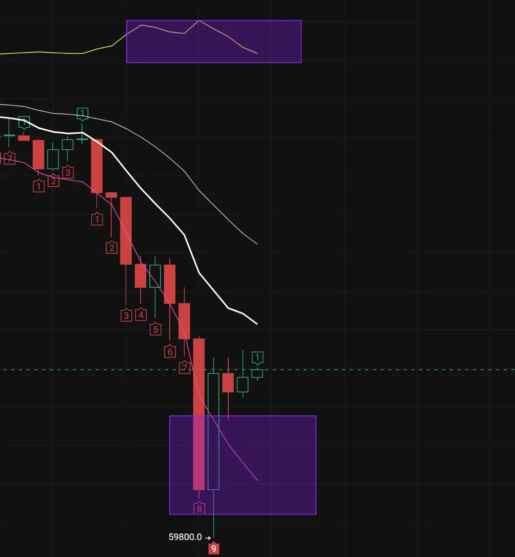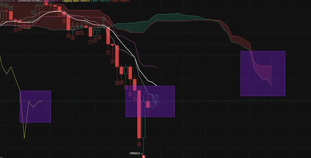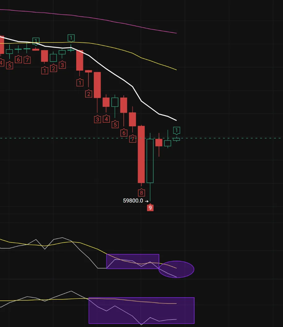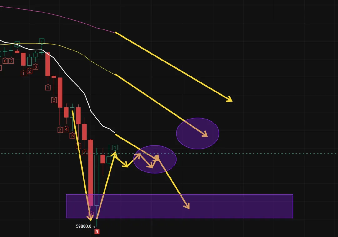 1、在均线的行情内,随着7.8万的再一次跌破,币价开启了暴力下探的动作,目前打至6万下方,但是暴力收回,所以本周还需要沉淀和调整,当币价经历盘整后均线下压还会再次下跌;