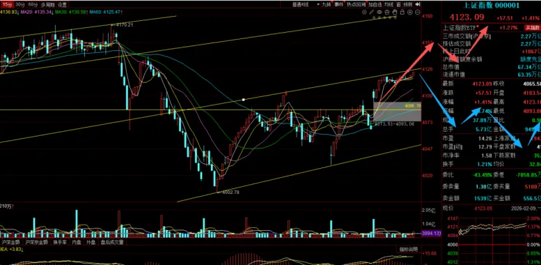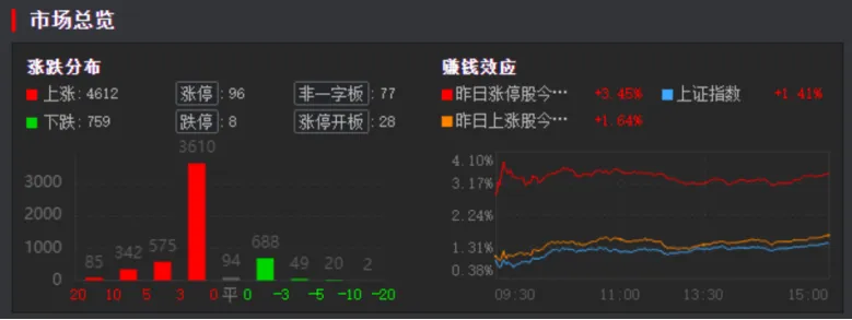 外围回暖,带动昨日A股三大指数集体高开,整体抛压有所衰竭,节前增量资金也略显不足,最终全天窄幅震荡,截至收盘,沪指涨1.41%报4123点,重新站上4100点,创业板指涨2.98%,科创50指数涨2.51%。全市场涨多跌少,上涨超过4600家,下跌不到800家,涨停96家,跌停8家,赚钱效应良好,但振幅较低的背景下,如果没有提前布局,日内交易的胜率也未必很高。