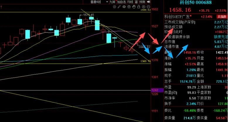科创连续调整后,迎来右侧突破,暂时做为一个止跌信号看待,前期恐慌时期的套牢盘仍需时间消化,因此节前直接V上去的概率比较有限,预计重新上攻之前,仍需震荡磨底,节前反弹压力位关注1500整数关口,支撑位关注前低1422附近。