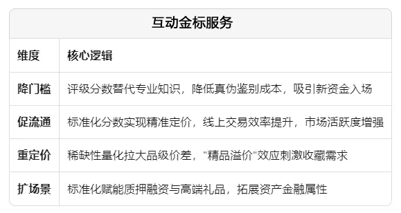藏品的品相甄辨与真伪核验,仅是行业基础痛点的解决,互动金标更深层的价值,在于构建 “认证 + 赋能 + 流通” 三维价值模型。依托严苛原票筛选、全链路防伪溯源及荧光隐签等创新工艺,将评级从后置保障升级为前置价值发现,真正实现藏品赋能升级与流通效率提升,大幅强化其流动性溢价与资产配置属性。
