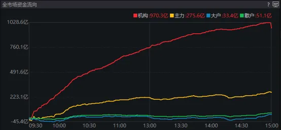 第二:资金数据看,今天全天机构资金连续第5个交易日净流入,今天更是净流入970亿,也说明机构资金没有放假,而是趁着多数人处在节日氛围内的时候,在悄然介入!