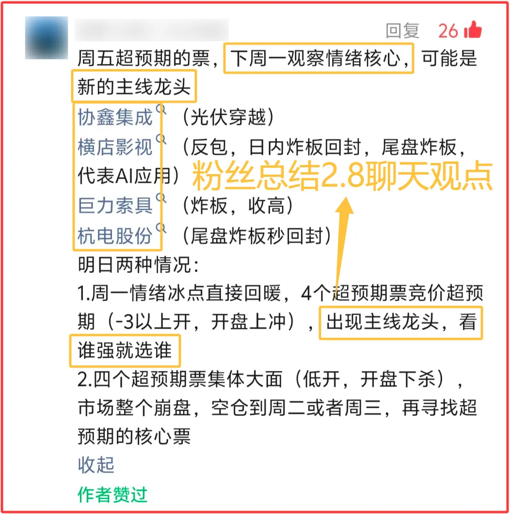 这是粉丝总结的周日聊天室老徐的观点。简单描述就是竞价四大核心高开那么情绪开启大周期主升,核心依旧是这四个票,去弱留强即可。并且昨天聊天室老徐还特地主观的聊了一下自己对于情绪看法,更多偏向于主升观点。