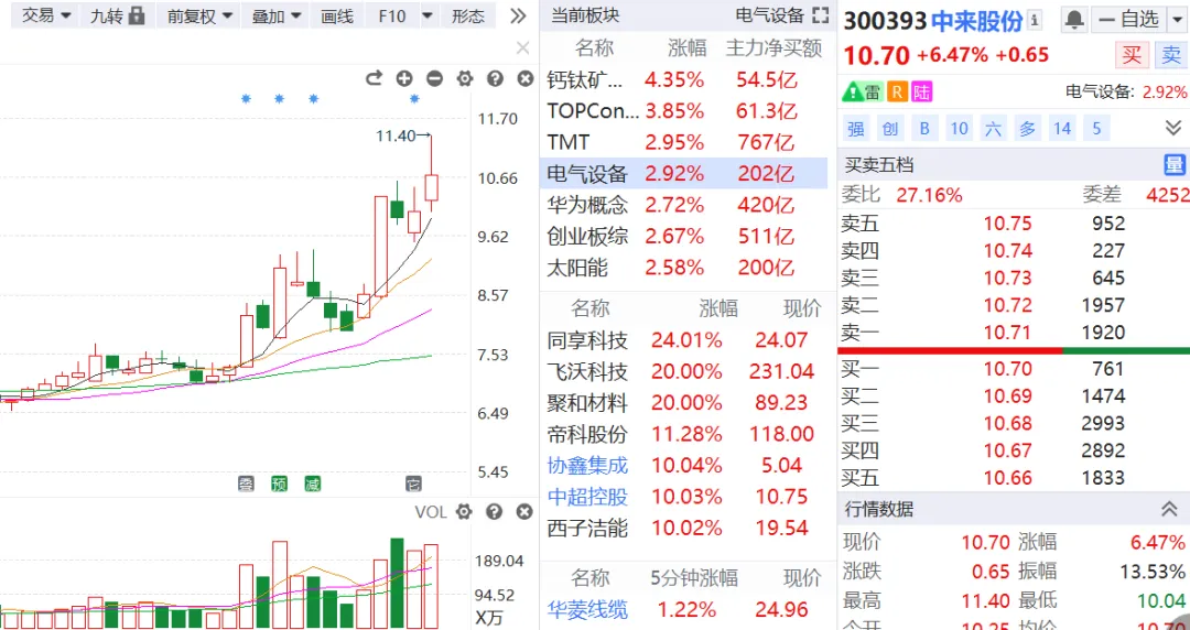 2. 中来股份:太空光伏核心标的,盯盘便捷,今日板块虽有冲高回落,但逻辑仍在,坚定布局