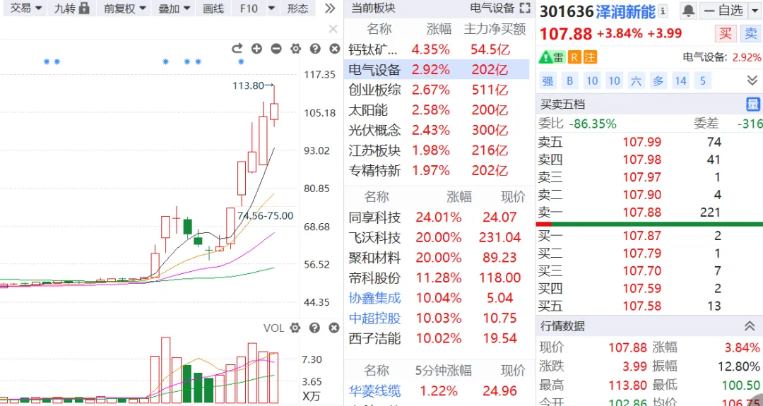 4. 泽润新能:太空光伏优质标的,尾盘接回,看好后续拉升空间