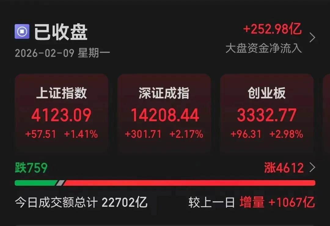 提个醒:最近微信推送有所变化,喜欢我文章的朋友点点“在看”和“赞”,避免出现系统认为你对文章不感兴趣,后面默认不推送或延迟推送的情况出现!今天是个好日子!这应该是大家的心声吧?虽然还没有真正过年,但周一的红包行情是安排到位了。可能不少人上周还在提心吊胆,但是大家最近看元哥文章应该非常淡定。已经正式进入节前最后一周了,还会不会有红包行情呢?元哥认为,大概率还是会有的,大家放心!受隔夜外围市场大涨影响,三大指数集体高开,短暂回落后震荡上行。午后涨幅进一步扩大,沪指再次站上4100点,深成指和创业板指的涨幅均超过两个点。不仅全市场超4600家上涨,而且商业航天、AI应用以及CPO等热门板块表现抢眼。市场情绪出现明显修复,出现不错的赚米效应。具体板块表现方面,AI应用板块的涨幅遥遥领先。以影视院线、Sora概念、短剧游戏以及AI语料等为代表的板块涨幅居前,主要是受字节发布名为Seedance2.0的AI视频生成模型的消息面刺激。其实测效果非常惊艳,再加上春节AI红包大战的影响,导致板块内部出现涨停潮。同时,商业航天板块也很出色。特别是太空光伏方向,也爆发了涨停潮。不论是BC电池,还是光伏设备等板块的大涨,都要感谢马斯克画K线了。另外,CPO板块表现也很不错,这离不开北美大厂上调资本开支以及英伟达的大涨刺激。只有少数板块出现小幅回调,如油气开采以及燃气等板块。最后,说一下应对思路。今日指数跳空高开,沪指更是强势五连阳,对于市场情绪的修复效果非常明显。不出意外的话,沪指的连阳记录仍将延续。而且按照我国A股的惯例来看,春节前最后一周大概率就是红包行情。因此,还是那句话,大家握紧自己手里的筹码。如果有过节的需求,记得在周四适当落袋为安。整体思路依旧是把握消息面相关的低位板块,抓住高位板块分批落袋机会。不盲目追涨杀跌即可!如果大家有更多问题,可以先点赞、关注再评论,元哥会第一时间回复。保持点击,就是最好的支持