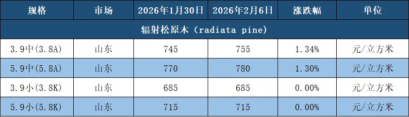 市场概述: 本周原木市场行情偏强运行。港口现货价格方面,山东原木港口现货价格750元/方,周内上涨10元/方,江苏原木现货价格780元/方,周内持平;下游成品价格方面,日照市场主流品牌3米辐射松建筑木方出厂含税报1270元/方,涨50元/方;4米辐射松建筑木方出厂含税报1240元/方,涨40元/方。