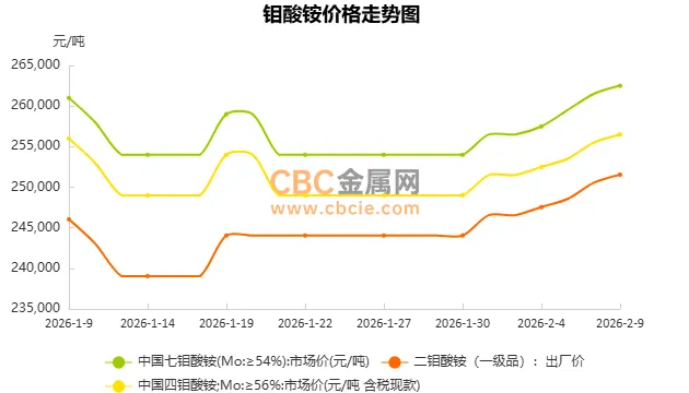 今日钼酸铵市场行情温和上行。下游化工、催化剂及石油炼化等领域保持稳定采购,提供了需求支撑。春节假期临近,部分下游用户为保障节后生产而进行适量备货,进一步稳固了市场挺价情绪。在成本与刚需共同作用下,价格呈现小幅上行走势。