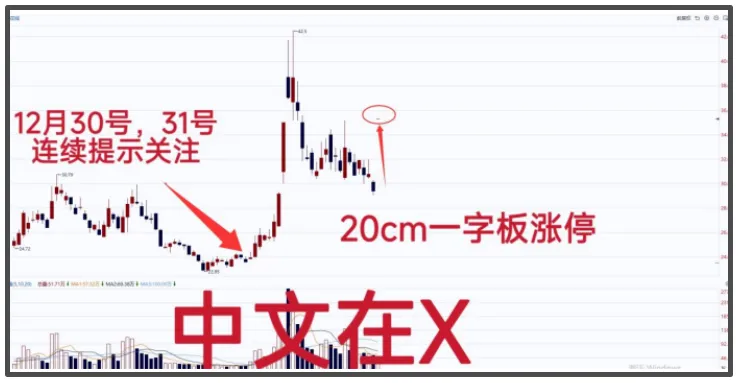 12月30号,31号文章提示的中文在X,后来也是走出了一波主升浪的行情,高位盘整后,今日该股20cm涨停。