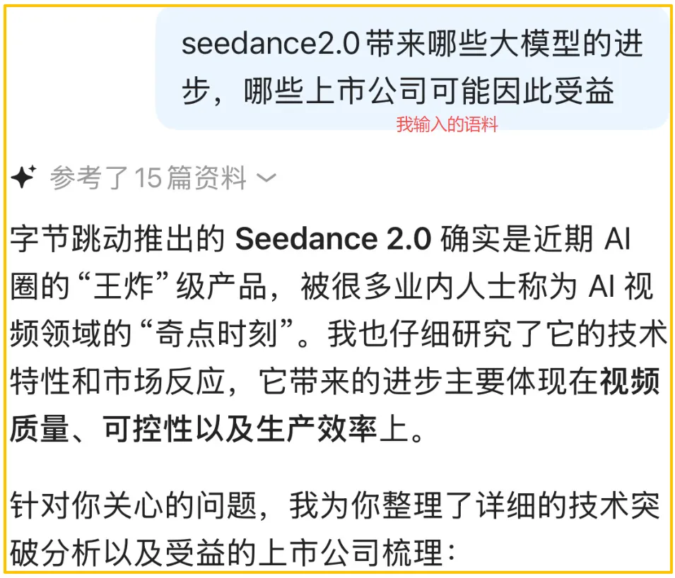 新家人有的不知道怎么看文章,有的说不能连续收到文章策略,错过不少机会,建议大家关注本公众号之后加上“星标”(如下图),这样根据平台推送规则,你才不会错过每天的文章以及里面的最新策略!多关注每天的留言区,你会有不小的意外收获!今天的红包行情无需多言,因为在上周四文章中我们就着重聊了变盘节点,该来的终将会来,这是结构上必须去走的,不以外界干扰而转移,只会或早或迟的出现,周五的美股反弹显然强化了反弹趋势。当然节前仍然不是我们重点折腾的时候,仍然以见好就收的心态来对待就好,午评我们聊到了兑现节点,今天不用急,明天后天可能刚刚好,看市场表现出来的力度再定。节前不表现的也不一定就差,大资金大机构提前放假的不在少数,哪怕今天这样的大涨,成交量也就是微微放大,好案例值得以长期心态去看待,不是非要只争朝夕,现在不是那样的节点,记得元旦前市场也走克制,那段时间振华调整一周,结果元旦回来就一阳收五阴,然后一波新高了,不要担心好公司短期不动,动起来都会很快,这是反复验证过的。还愿意折腾的资金都是短线为主,那就要比理解比手速,硬件这里昨天提到的OCS这里,“易中天”里面只有形态更好的天孚走出了新高,光缆这里作为硬件补涨就更热闹了,国内三巨头全部新高。数据中心配电相关的燃气轮机和SOFC方向也有不少班内跟踪案例走出新高,作为上游铬材料的振华自然也会受益。(风险提示:过往业绩不代表未来,单个案例不代表全部,部分案例仅作为教学演示参考)今天板块涨幅更好的是AI应用,也有新催化,和字节那个新视频模型有关,前年底震撼大家的是一分钟视频的sora,一年多后seedance更加惊艳,可能很多家人看不懂这些英文字母,不过我昨天文章和大家讲过怎么去运用AI工具辅助研究,这里就给大家做一个示范,只要你给出准确的语料,AI工具可以给你梳理需要了解的重点进展,对于投资者而言肯定会关心哪些公司受益,也会把核心的逻辑都梳理给你,你看红框区的这些案例,今天都顶了一字,你说巧不巧,大资金是不是有可能也在借助这些工具?(相关案例仅作为演示需要,不作为投资建议,风险自担)当然这里也要提醒大家,除了产业逻辑上的梳理,还是要注意这是短期催化还是长期催化,形态走势是否在验证逻辑的有效性,两相结合去提高你的胜率;技术上的缺陷有时候也会让AI工具出现一些“幻觉”错误,这也需要大家用心去分辨。我们生活在技术日新月异的时代,也是产业机会不断涌现的时代,这些新技术的出现一定需要一些基石产业作为底层保障,看懂底层的逻辑就看懂了产业终局,相关案例途中的休整和波折就不再重要。节前继续逢涨兑现仓位,保持合理的仓位过节就行,春季行情不差这几天。剩下的时间就交给大家,不明白的多多留言互动(特别是新来的家人),多给文章“点赞、推荐、转发、留言”,这样做的家人越多,就会被平台认为文章内容有价值,值得平台推荐,就会恢复推流,大家都会因此受益。互动越多成长也会越快,这是新粉变老粉、新手变高手必经之路。喜欢修安的分享,大家每天伸出发财小手,点“赞”+“在看”+“分享”,把公众号点上星标,就不会错过修安的策略文章了。