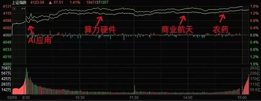 字节跳动近期推出的新一代AI视频生成模型Seedance2.0,凭借突破性性能刷屏海内外互联网。只需编写详细的提示或上传一张图片,Seedance 2.0 即可在60秒内生成带有原生音频的多镜头序列视频。受此消息刺激,短剧以及文生视频概念应声大涨,引爆AI应用端全线爆发,中文在 线、海看股 份、掌阅科 技、欢瑞世 纪等全天封死一字涨停,带动板块内十余只成分股涨停。而随着此前字节豆包、阿里千问、腾讯元宝、百度文心助手掀起的2026春节大模型流量大战,算力租赁以及数据中心产业链热度也居高不下,大位科 技、利通电 子、协鑫能 科均封死涨停,回顾最近几年的春节前后行情,AI产业链均未缺席,因此今日资金的大举抢筹也不排除对春节期间相关消息面发酵预期展开博弈,而当前整个应用端强度仍需聚焦Seedance概念以及几大科技巨头新版大模型发布两大核心因素。英伟达CEO黄仁勋最新指出,当前大规模的AI资本开支不仅是“适宜的、必要的”,更强调这是“人类历史上最大的基建”的早期到中段,还要持续7-8年。此外最近一周海外亚马逊、谷歌、微软和Meta等海外主要CSP大厂披露最新财报,2026年资本开支合计将达6600亿美元,同比大幅增长60%。随着美股科技股全线回暖,算力硬件股再掀高潮,杰普特封死20厘米涨停,此外天孚通 信、长盈 通、蘅东 光、炬光科 技等多股涨超10%,创出历史或阶段新高。黄仁勋上述表态,无疑打消了此前市场对AI投资过热以及持续性的疑虑,因此今年业绩高增长确定性强的光模块产业链等硬件端仍是资金回流的重点方向,但整个硬件端多数核心品种仍处于历史高点附近,若市场风偏无法持续改善,短线资金追高意愿或相对有限。①据媒体援引知情人士报道,特斯拉正在美国多地评估选址,计划扩大太阳能电池制造业务,目标在未来三年内实现每年100吉瓦的太阳能制造能力。受此消息刺激,太空光伏产业链卷土重来,协鑫集 成晋级4连板,亚玛 顿、拓日新 能、金晶科 技等多股涨停。不过此前领涨板块的几只20厘米设备端趋势抱团人气股盘中抛压不轻,连城数 控、迈为股 份、捷佳伟 创、奥特 维等纷纷走出冲高回落或高开低走行情,可见当前该板块短线资金仍尝试发动一些板块内的超跌低价投机品种以刺激人气,而趋势抱团资金主导的容量大票的低迷仍制约板块短期向上高度,因此对于一些低价纯投机品种的态度仍应适当谨慎。②年初至今,分散染料的核心中间体还原物开启涨价,已从去年的2.5万元/吨飙升50%以上至3.8万元/吨,随后浙江龙盛在内的多家分散染料企业先后宣布上调产品出厂价。分散染料概念延续上周强势,闰土股 份、亚邦股 份、福莱蒽 特、海翔 药业等多股涨停。除去分散染料外,包括甲醇、草甘膦、环氧丙烷等化工细分均有不俗表现,金牛化 工、红太 阳、华尔 泰等悉数涨停。与同属顺周期行业的有色板块有所区别的是,当前有色板块走势仍与相关期货价格波动高度绑定,而化工板块的驱动核心仍是行业内产能以及外部需求持续向国内龙头企业集中的逻辑,而并非涨价本身。因此与有色板块仍以趋势抱团资金主导不同的是,化工板块更偏向情绪化而容易出现一些连板接力投机品种,但行业内细分方向众多且相关性不足也制约其短期热度的扩散。