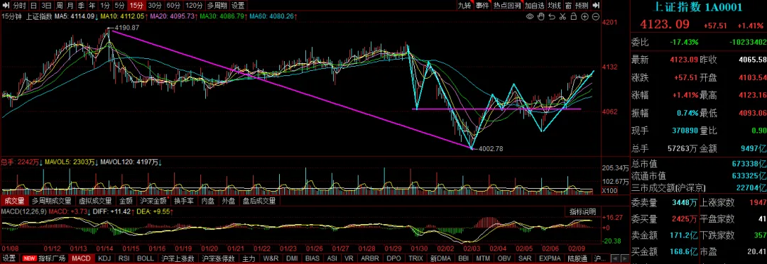 今日沪深两市成交2.25万亿,成交量较上一交易日放量1038亿。两市实际上涨4372家,实际下跌717家,实际涨停83家,实际跌停3家。主流资金今日净买入261.26亿元,下图是今日资金进攻的板块路径今日市场全天呈现高开高走态势,其中创业板指大涨超3%,沪指录得日线5连阳收复4100点。全市场超4600股飘红的同时,成交金额也小幅放大至近2.3万亿。从个股方面看,非ST个股超120股涨停或涨超10%,而跌停个股仅有三只,多头再度占据压倒性优势。虽然今日市场的强反弹仍以外围市场的带动为主,但基于上周提到的,在几大强势板块补跌后,空方力量已经得到充分释放,因此市场在今日普涨反弹后仍有望维持强势。从指数方面看,虽然几大主要指数已经悉数收复5日均线,且沪指和创业板指已经收复日线布林中轨线,但日线MACD尚未实现金叉,因此短期多空双方或继续围绕日线布林中轨线展开争夺。节前最后一周,今日市场运行还可以,接近光头小阳线的走势。近期中线观点很清晰,趋势处于上涨,中线看多。目前走势出现小的变化,上证指数15分钟出现底分型回抽确认住前高的小三买,因此接下来要观察小三买低点的得失,如果小三买低点能守住,节前存在短线震荡上扬的概率;反之如果小三买低点被跌破,走势就容易拉回中枢继续震荡。