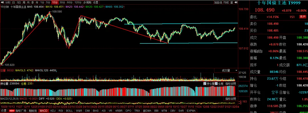 上图是十年期国债期货的15分钟K线走势图,目前15分钟是下跌一笔。1分钟上涨笔,目前股债的策略应该是债横盘,股票市场趋势向上。
