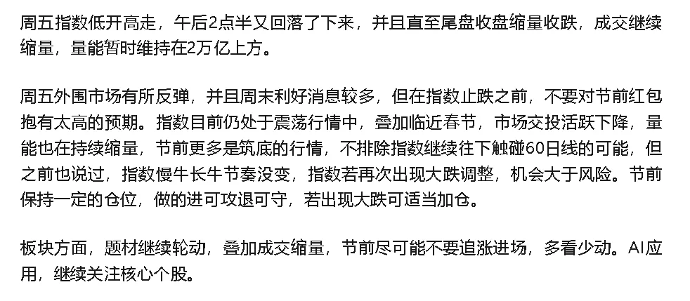 市场永远是对的,错误的是你的预期和策略,不要与市场争辩,而要与自己和解!!!今天指数高开高走,放量上涨,上证和创业板都回到了5日线上方,成交放量,量能维持在2万亿上方。今天虽然是普涨行情,成交也有所放量,但量能放量放的不够多,主要还是临近春节,交投活跃下降。剩下四天交易日,个人认为,指数继续放量上涨的概率不大,更大概率是横盘震荡洗洗盘,各路资金捡捡筹码,为节后行情做准备,特别是两会前的行情做准备,所以,接下来行情若再次出现大跌调整,机会大于风险。保持一定仓位,做到进可攻退可守,大跌大买,小跌小买。板块方面,AI应用相关方向今天大涨,也不枉一月以来一直的关注,还是那句话,2026是AI应用有大机会,会有跟AI硬件一样行情机会,继续关注核心个股;化工等涨价方向,各个方向的涨价消息纷纷出现,要进就早进,不要等涨起来再追涨。一、风险警示:两家公司对市场炒作发出明确警告