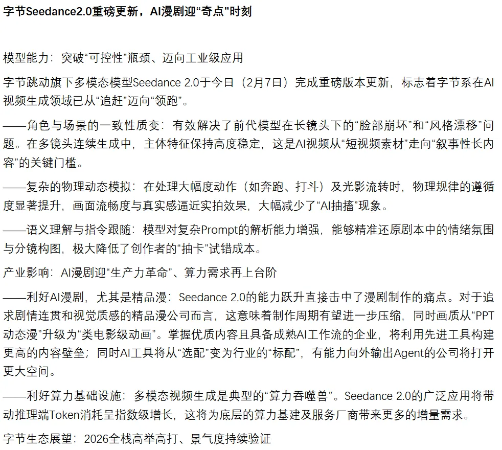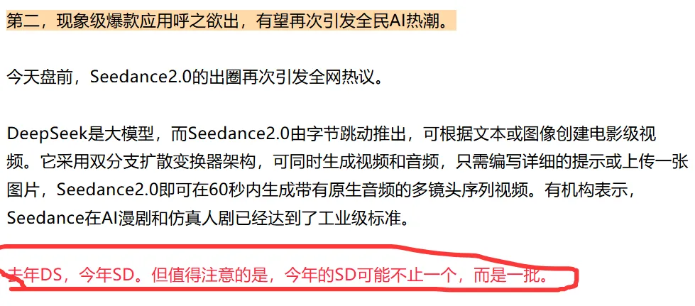 今晚,已经有大V将Seedance2.0类比去年初的DeepSeek了——有可能引爆一波超级大行情,主角是AI应用!