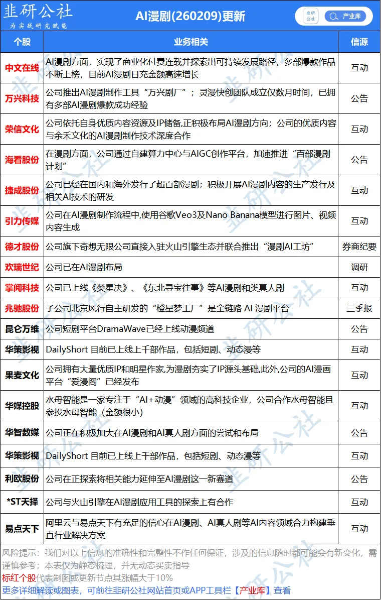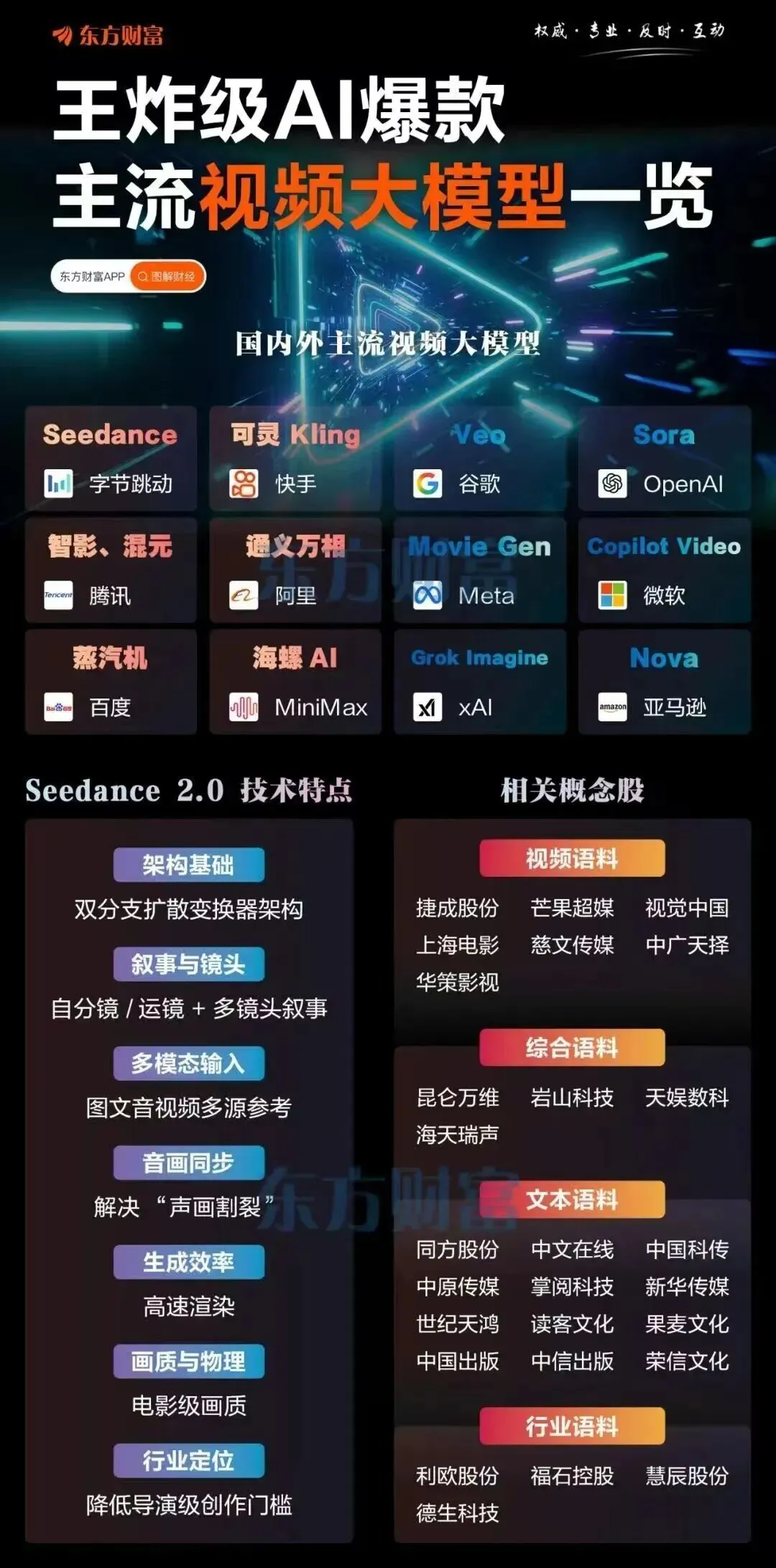 今天AI赛道炒作的最主要导火索,就是昨晚讲的Seedance2.0的话题大火,今天不少概念股直接一字涨停、包括20CM涨停,直接引爆了AI应用(AI漫剧概念为首)、AI算力(CPO概念为首,光纤涨价概念持续强势)、字节跳动相关概念、数据要素概念等。