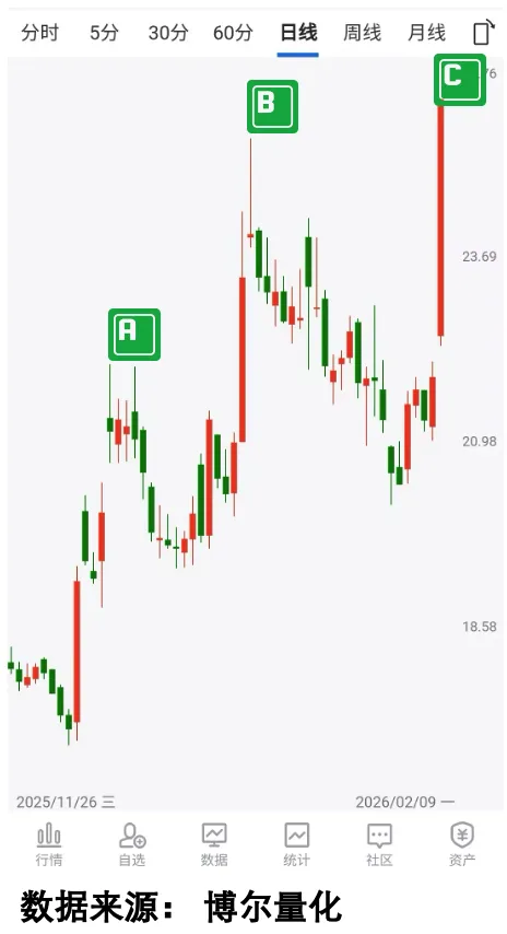 咱们先站在上帝视角回头看走势图的股价走势:从最开始的低位一路攀升到高点C,要是能全程持有,轻轻松松就能跟着股价上涨赚得盆满钵满;再看高点B和高点C,两者价格几乎持平——就算当时在高点B卖掉,其实也没什么好遗憾的。