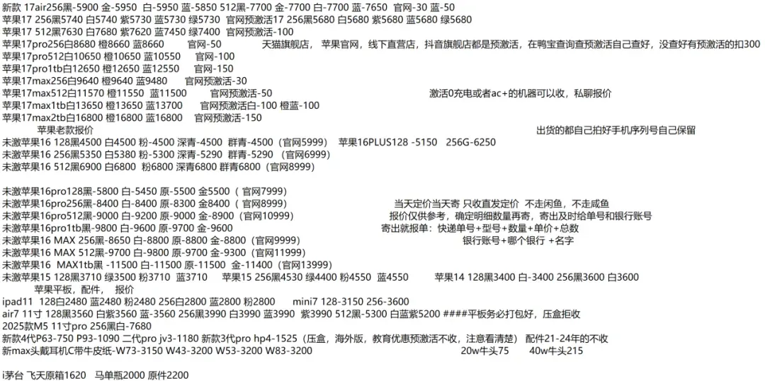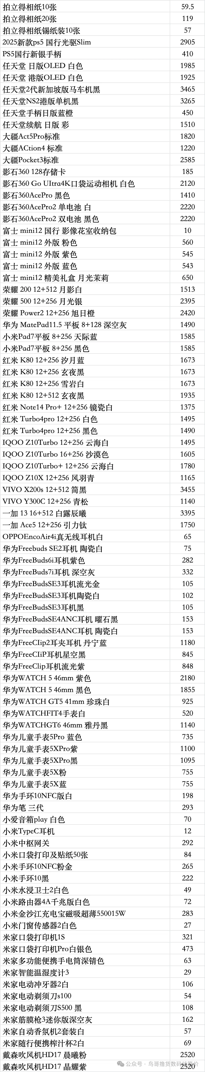 任天堂游戏机: 新款二代NS2港版标配机:3270 新款二代NS2港版马车机:3445,没游戏码:3215(注意下单要看有没有游戏码的 要不然就是便宜的) 新款二代NS2新加坡版 台版 单机:3195,就是没有游戏的 新款二代NS2韩版 欧版 美版 单机:3145,就是没有游戏的 新款二代NS2新加坡版同捆:3465 NS2港版宝可梦同捆:3565 OLED屏 日版白-2000 彩色-2025 OLED屏 港版白-1935 彩色-1965 OLED屏 国行白-1640 彩色-1640 OLED屏 朱紫港版-1970 日版-1970 OLED屏 喷射港版-1970 日版-1970 健身环国行-145 海外版-340 LITE日版 港版 蓝:1035,黑粉1035,绿黄1035 注意区分,这些就不是oled屏的 价格以下(续航版) NS续航国彩-1420 黑-1300,拆封-50 NS港彩续航- 长款- NS续航日彩-1510 黑-1440 长款-50 索尼PS5游戏机 (PS5都要留好纸箱带来,以免破坏品相) 2024新款:PS5 PRO日数:4700 2024新款:PS5 PRO港数:5120 2025新款:PS5 PRO国数:4650 2023新款ps5 日版光驱Slim:3150 2023新款ps5 日版数字Slim:2690 2023新款ps5 国行光驱Slim:老款:2890,新款2905 2023新款ps5 国行数字Slim:2280 2023新款ps5 港版光驱Slim:3200 2023新款ps5 港版数字Slim:2690 PS5国行手柄:黑白410,其他410,外版-20 只收跨境 PSP串流机:1345白,1345黑 PS5单光驱:615,外版575 ROG XBOX : OLED SteamDeck掌机掌上游戏机 512G 美:3990,日港:399 OLED SteamDeck掌机掌上游戏机 1TB 美:4610,日港:4610 大疆3标准:,全能: 大疆Action4标准:,全能: 大疆ACT5 Pro标准:,全能: 大疆action5pro畅拍: 大疆AC6标准: 大疆AC6畅拍: 大疆NEO标配:,全能: 大疆OM7P:,om7: 大疆 mic1拖1:,1拖2: o4图传: 拍立得MINI12影像花室套装:,外版,一次成像礼盒装 拍立得SE国行:,白色: 拍立得相纸20张:119,10张:59.5 拍立得锡纸装10张:57 任天堂 手柄 NS左右手柄:385 NS2左右手柄:430 NS2 PRO 黑柄:420 PRO国黑柄:305,外版280只收跨境 PRO乱斗柄:320只收跨境 PRO王泪柄:340只收跨境 PRO喷射柄:340只收跨境 PRO异度柄:340只收跨境 2026年2月9日 华为配件全系列 行情参考 以结算价为准 所有货都不收国补的,一经发现就当送我们的 华为手表系列 华为 Watch FiT4 黑535白520绿555紫535银575 华为 Watch FIT4 pro 黑1150蓝1105绿1185 华为WATCH FIT 2活力款 黑色325粉325 华为WATCH FIT 3 黑440灰465月光白440原野绿445粉435薄荷绿445蓝435珍珠白475 Watch D2 黑 2785白2670蓝2685 Watch D2 药房版 2445 Watch buds 黑1135卡其色 1205 GT4 41m 白 795黑695草木绿00 GT4 46m 黑845棕00绿 00 Watch 4 黑 00褐 00白 00 Watch 4pro 棕 00火星钢00蓝00太空探索 00 Watch 5 46m 黑1855紫2180棕 2275蓝1885钛空银 2655 Watch 5 42m 黑1715白1875杏2255绿1725金2355 非凡2 黑4995蓝5995 非凡手表 黑3395蓝 00绿00 华为新款WATCH GT5系列 GT5 46黑1115蓝930棕915灰910 GT5 41 黑 955蓝890白925青865棕855 GT5pro 黑1190陶瓷2145钛钢色 1425冰川白1015 GT6 pro 黑1800棕2095钢2510 GT6 46m黑 1140灰色 1270绿色 1445 GT6 41m 黑 1070棕色 1445白色 1255紫色1055蓝1035 华为儿童手表系列 儿童4pro蓝490粉490 儿童5pro 蓝745粉735绿745紫745 儿童5X 蓝755粉755 儿童5Xpro 黑1095紫1100 儿童5 绿350紫350蓝415活力蓝350红345 儿童5星耀 粉405蓝420 荣耀手环,华为手环 荣耀手环9标准黑90蓝100紫100 荣耀手环9NFC 黑115蓝115紫115 荣耀手环10标准黑130绿135灰135蓝135 荣耀手环10NFC 黑155灰155绿155蓝150 华为手环系列 华为手环8标准黑103粉105 华为手环8NFC 黑105 华为手环9 黑155白145粉143黄 140蓝145 华为手环9nfc版 黑160白150粉150蓝150黄150 华为手环10标准 黑158粉160 华为手环10铝合金款 黑165白167蓝168紫168向新绿155原野绿155灰155 华为手环10NFC 黑185白193蓝195紫198绿188 B7 黑700灰700 华为耳机系列 华为Free Arc 绿405灰415黑415 华为 FreeBuds 7i 白330灰325粉330 华为freebuds6i耳机 白262黑270紫280 华为耳机Free clip2 黑1180白1180蓝1180 华为耳机Free clip 黑色845暖星云925紫 848玫瑰金845 华为耳机FreeBuds 5i 黑227白218蓝213 华为FreeBuds se2 耳机 白72蓝73黑73紫74 华为 FreeBuds se3 黑103金103白100 华为 FreeBuds Se4 白152黑152 FreeBuds 6 白535黑540紫530金530 FreeBuds 4e 2024款 白285银285 FreeBuds pro5 白1110银1110金1095 FreeBuds pro4 黑715绿705白730 华为CD56 pro笔 465 华为CD57 黑335白350 华为CD54S 三代笔290 华为 三代笔充电器 78 Wifi5 黑175白175青173 WiFi3 pro 265 AX3 115 AX6 new 225 AX3 pro new 197 AX3 pro WiFi7 187 BE3pro 千兆版 180 BE3pro 疾风版 167 BE7pro 390 AX2pro 100 Q6 一拖一凌宵版 465 荣耀手表 荣耀手表4pro 黑725棕825绿795 荣耀手表5pro 蓝牙版黑1075灰1075 荣耀手表5pro 插卡版黑1175灰1175 荣耀手表5Ultra黑1215棕1445钛金属1895 荣耀手表5 黑525金525 移动电源 华为22.5w se 移动电源 黑85白90 华为66w 电源 白180蓝190 |