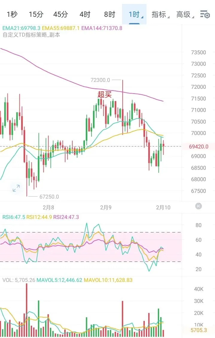 关键转折在于多头随后持续放量,推动价格稳步回升并强势站稳69700一线。这不仅意味着下方承接力强劲,更表明市场买盘力量依然占据主导,将不利的震荡转化为了一次扎实的探底回升。