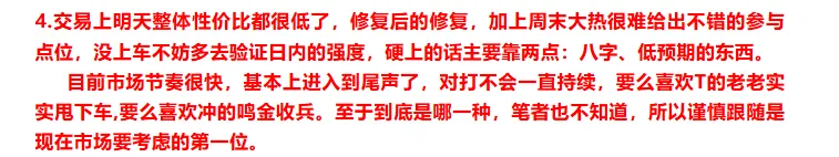 3.情绪一直在强调边际回暖,周五反核TKG伏后,周末外盘发酵,获利盘过大,尾盘分歧倒也是预期内的事情,这边跌跌撞撞的,还是那句话情绪比较开盲盒,但是主要集中在趋势线的G纤、主题的TKG伏以及日内发酵的应用。后续淘汰出来再看谁能强者恒强。笔者因为TKG伏持仓不偏核心,这边日内获利了结了;减仓继续支持下最高(注:本公众号涉及情绪的标不过多强调,买了也就图一乐呵~)4.其实说了这么多,明天怎么都不是好的入手点了,市场这个级别的量能,还是不要太上头,毕竟好运不常有。明天开始又是剧本操作,分化,核心走强的剧本,既然是情绪牵引的结构性行情多观察各方面情绪核心的强度为后面交易做铺垫就好了~