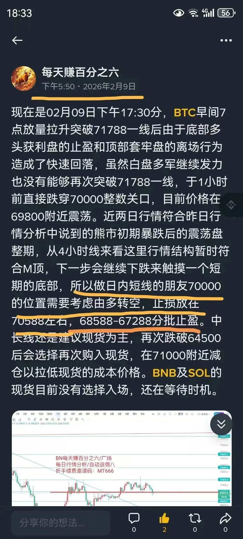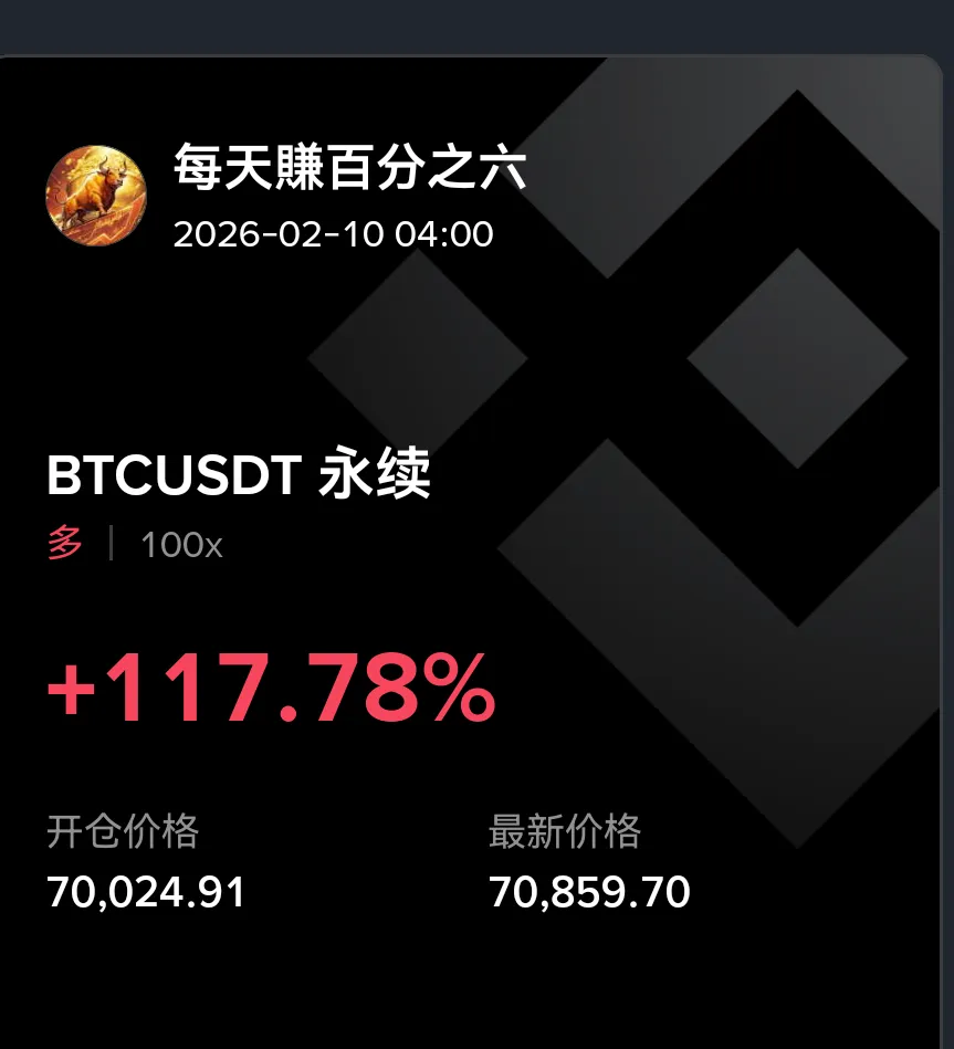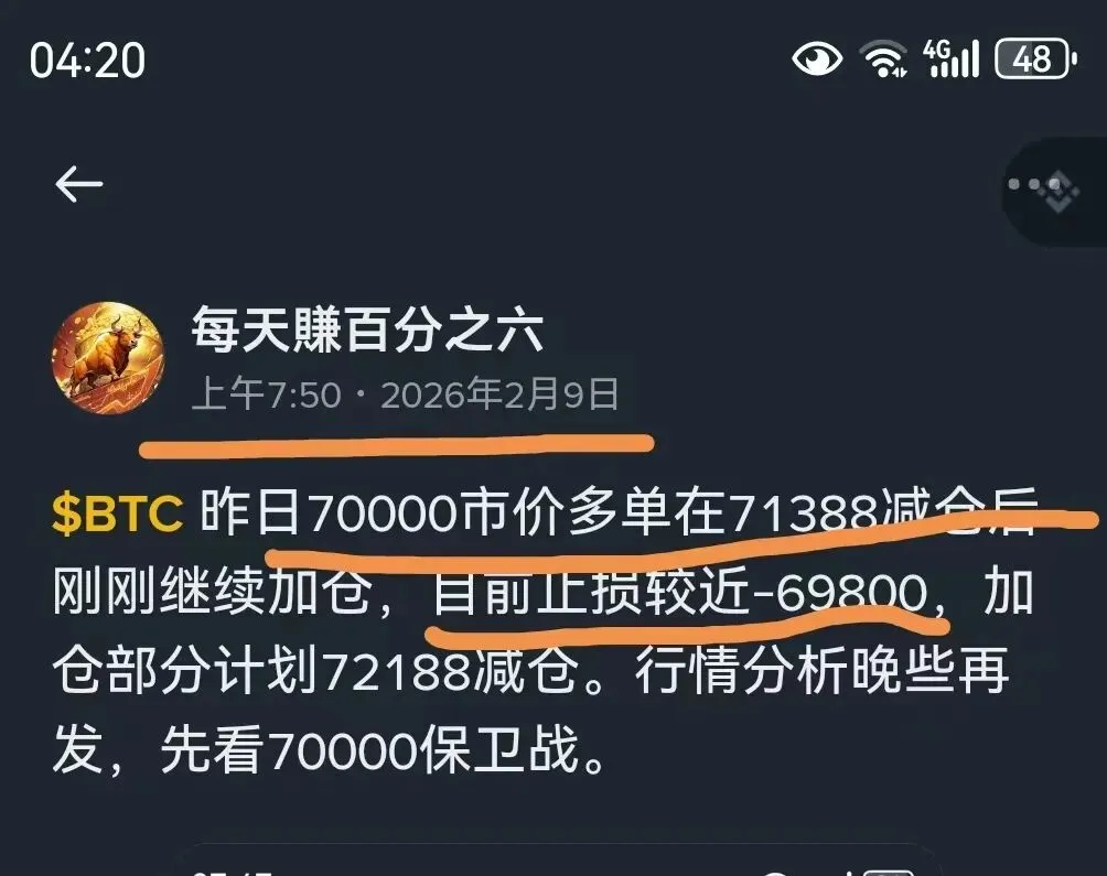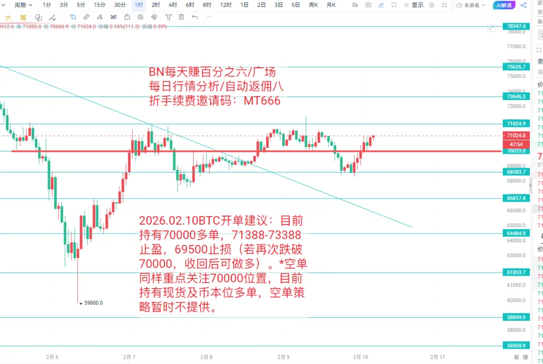 现在是02月10日凌晨04:10分,昨日围绕70000整数的多单及空单均在策略点位减仓后成本跑路,其中多单本该为三次,睡觉错过了一次机会,只做了两次,目前持有零点左右进入的70000市价多单,已做成本防守,计划依旧在71388减仓,70000点位再次被撸秃噜皮。