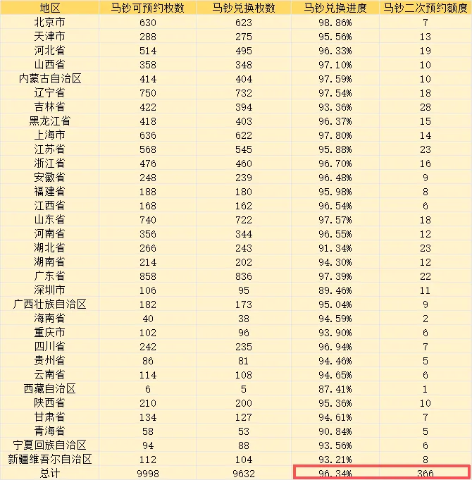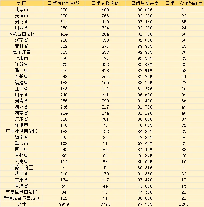马年币:全国兑换进度达87.97%,累计兑换8796万枚,剩余1203万枚进入二次预约池。马年钞较少,很可能只能约10张,算下来仅36万人能抢到!各省预约网点也会大大缩减!一经公告,我们将按省份整理更新!马年纪念币还有1203万枚,马年纪念钞有366万张剩余,按惯例,这些剩余的数量将进行二次预约兑换。22:00先约马币,每人可约20枚,22:30再约马钞,每人可约10张,千万不要再错过了!二次预约预计会在4-5月份左右开展,具体时间需等央行公告,有消息我也会第一时间发文通知大家。