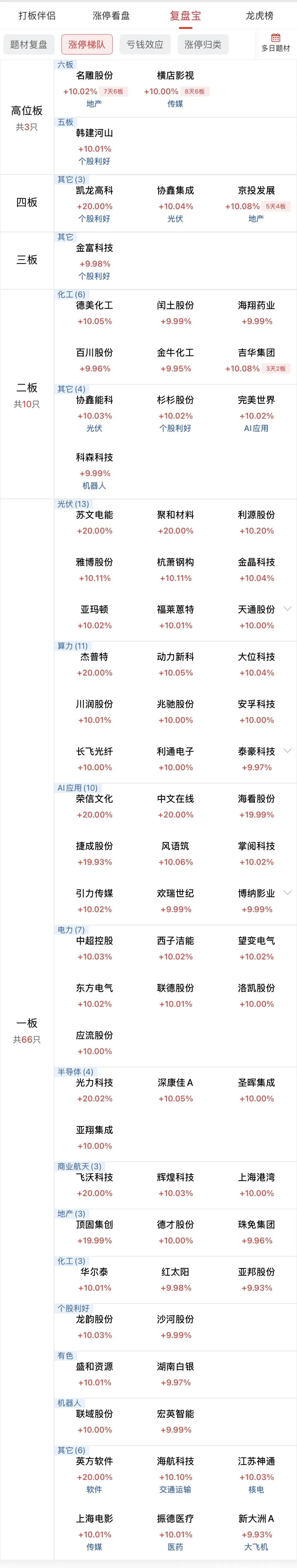 三大指数高开后全天强势震荡,上证指数涨超1%,创业板指涨近3%,收盘两市总成交超2.2万亿,相较前一交易日放量5%,上涨个股超4000家。市场氛围强势,题材全天快速轮动。AI应用端掌阅科技、欢瑞世纪等多股大单一字,中文在线秒板,权重三六零午后涨停。太空光伏协鑫集成四连板,TCL中环、拓日新能回封四天二板,双良节能炸板。此外人工智能硬件权重天孚通信触及涨停,长飞光纤回封涨停,杭电股份炸板。化工板块百川股份九天六板,闰土股份二连板。另有商业航天中超控股涨停,有色金属湖南白银涨停。短线情绪整体强势,高位股横店影视、百川股份、长飞光纤等涨停创新高,协鑫集成四连板,韩建河山尾盘大长腿五连板。