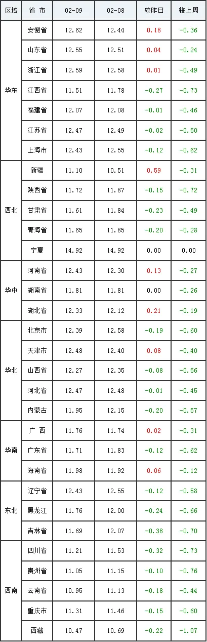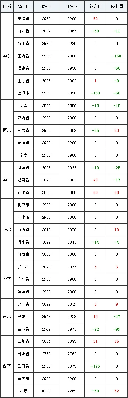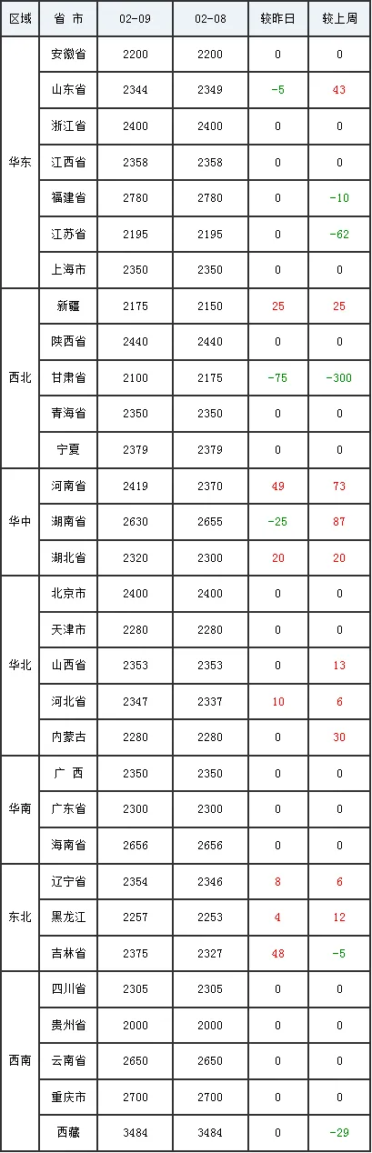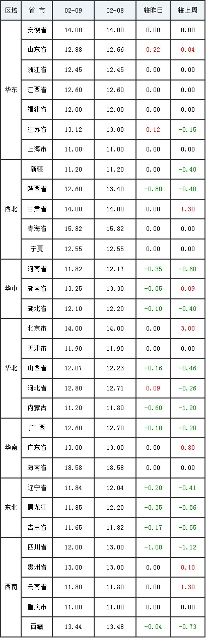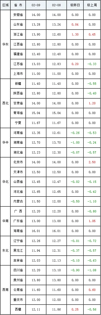 2月10日全国外三元生猪价格行情涨跌表