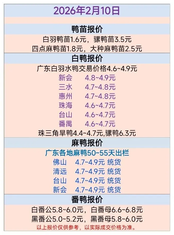 今日广东白羽水鸭价格上涨,报4.6~4.9元(7斤以上标准),旱鸭价格稳定,报4.4~4.7元;骡鸭价格稳定,报6.3元;麻鸭价格上涨,报4.7~4.9元;白番公鸭价格稳定,报5.8~6.0元;白番母鸭价格上涨,报6.6~6.8元;黑番公鸭价格上涨,报5.0~5.2元;黑番母鸭价格稳定,报5.8~6.0元。今日白鸭苗价格上涨,报1.6元;四点麻鸭苗价格稳定,报1.8元;大种麻鸭苗价格稳定,报2.5元;骡鸭苗价格稳定,报3.5元。广东大种白番公苗报4.6~5.1元, 大种白番母苗报5.6~6.1元;广东大花黑番公苗报2.6~3.1元, 大花黑番母苗报6.5~6.9元。