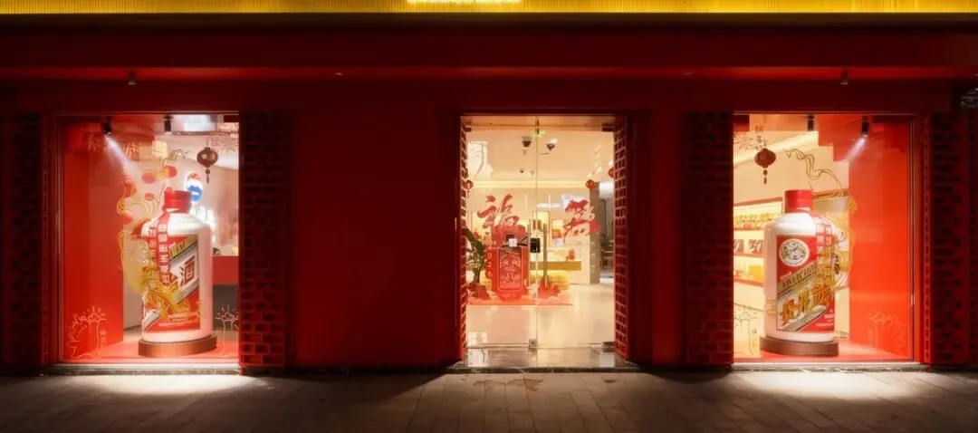 走近橱窗亮点:下方两侧橱窗,不仅展示了茅台超级符号飞天酒瓶,还有美丽的飞天仙女图案,充满生命力的仙女形象向内飞舞,每一位进店的人都能感受到这份美好、和谐与吉祥。