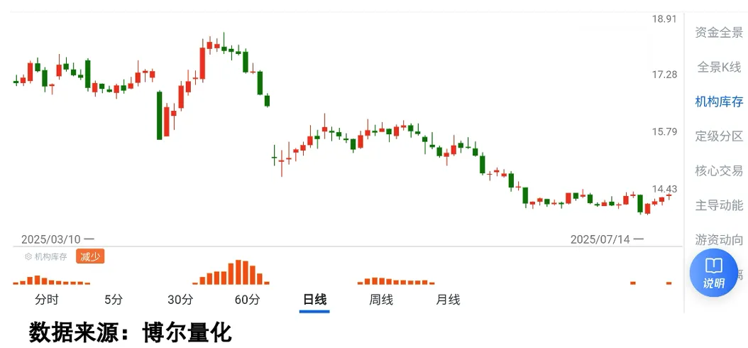 相比之下,那些「机构库存」数据不活跃的个股,也就是机构资金没有在积极参与交易,比如当时创新药概念中跌幅最大那一只股票,我们看下面这张图,会发现其实「机构库存」数据活跃的时间很短,难怪表现不佳,但是多数人看不到这个数据,但看走势的话,其实很容易上当,尤其是行情刚起来的时候,它比前面说的那只股票表现好太多了,但显然这是一场骗局。