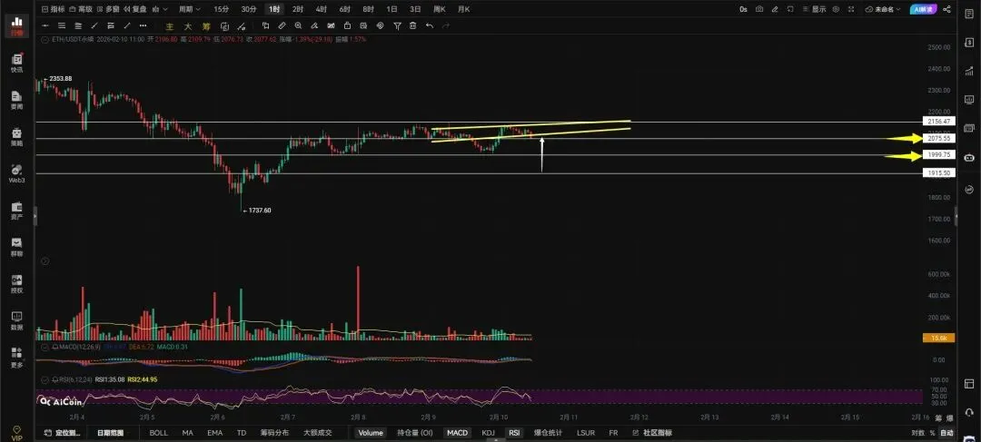 4小时级别跌破2100向下看2030-1994。二饼楔形如果被跌破2075的支撑会被顺破,会再次去回踩2000附近的支撑,其实这几天二饼一直在走交易区间,区间范围就是2156-2000的宽幅震荡,在没有走出明确方向之前你可以围绕这个区间做高抛低吸,散会。