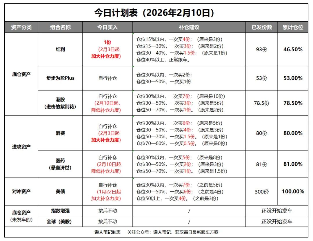 底仓资产,红利组合发车1份,2月3日起加大补仓力度。