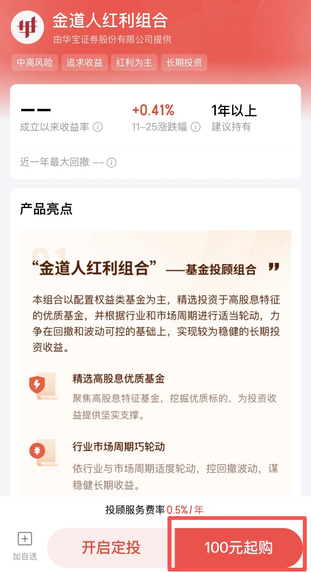进入对应的组合页面后,点击右下角的“100元起购”按钮,即可跟投。