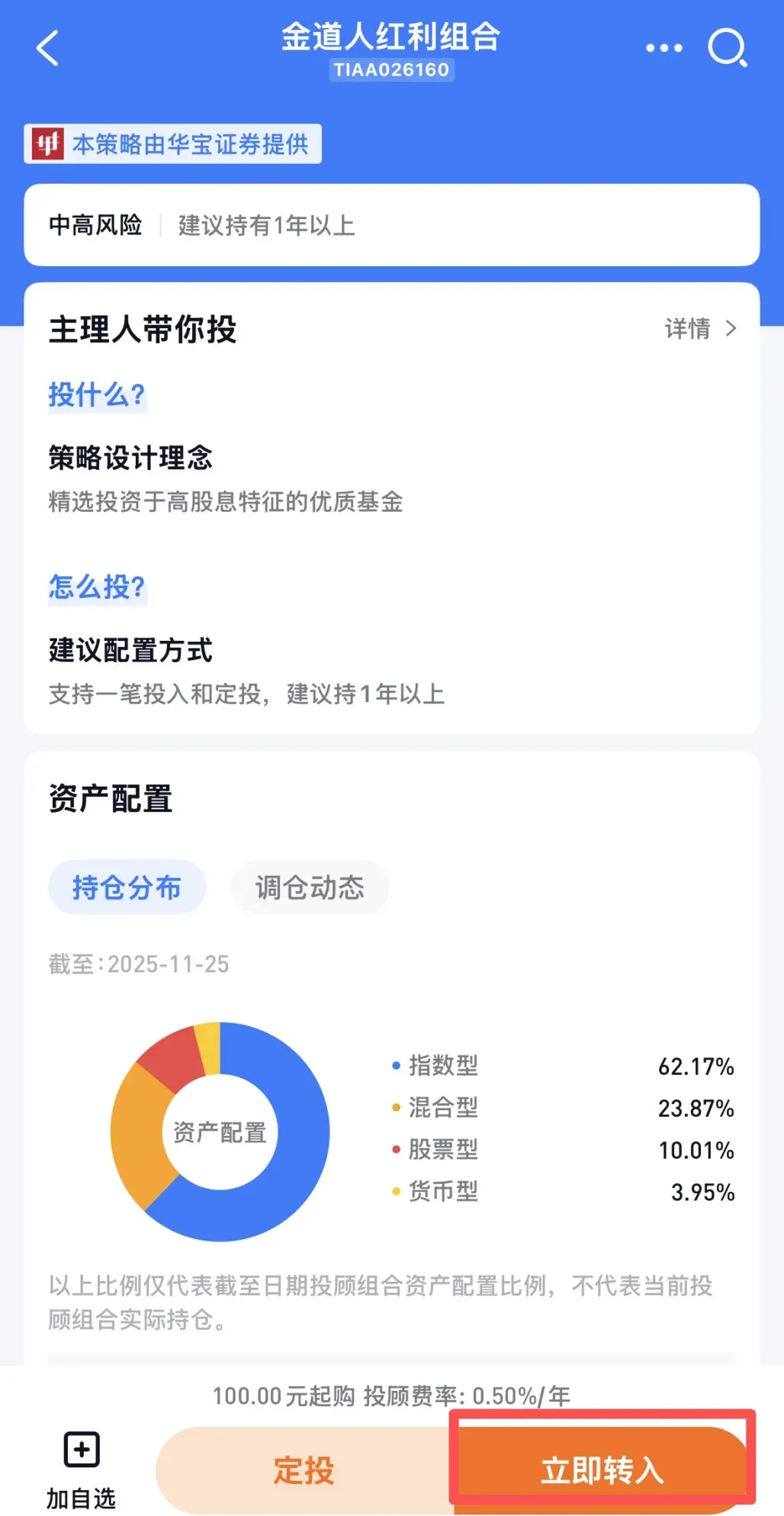 进入页面后,点击右下角“立即转入”按钮,即可跟投。